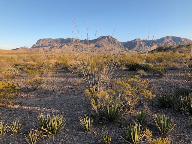 Our buddy from the Starlight Theatre was right. We woke in the morning light and discovered that the plains dotted with oil wells that we drove through in Odessa at dusk had disappeared in the darkness and had given way to a sculpted land of mountains and desert in every direction, punctuated by agave, creosote, sotol, prickly pear, and other desert flora. It was fascinating and beautiful, and the photos that I saw from my months of research didn’t come close to conveying the expansiveness and awe-inspiring views in front of us.